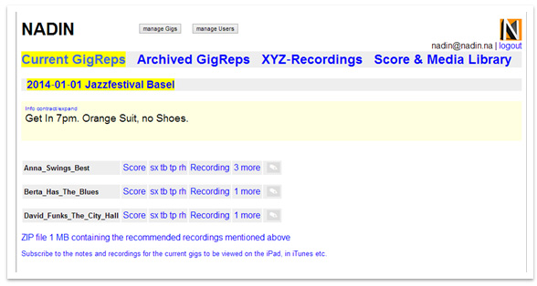 In NADIN, a band’s complete music library can be managed. NADIN administrators can put together the set lists of gigs by mouse clicks and make them available to the band members, including download links for the appropriate notes and recordings. Past gigs can be archived. In the administration, user rights can be defined (e.g. access only to the sax score for the current gigs, but not to archived gigs, and not to the music library).